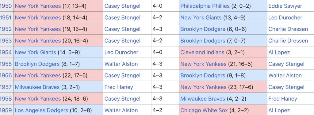 Out of their twenty-seven championships, the Yankees won an absurd six rings in the 1950’s. On further review, a New York baseball club represented the city every single year of the decade (except one, see below) in the World Series, with five of those matchups being an all New York contest. Albeit through the narrow of narrowest lenses, I found, unequivocally, when New York was actually at the absolute pinnacle of the baseball world.
